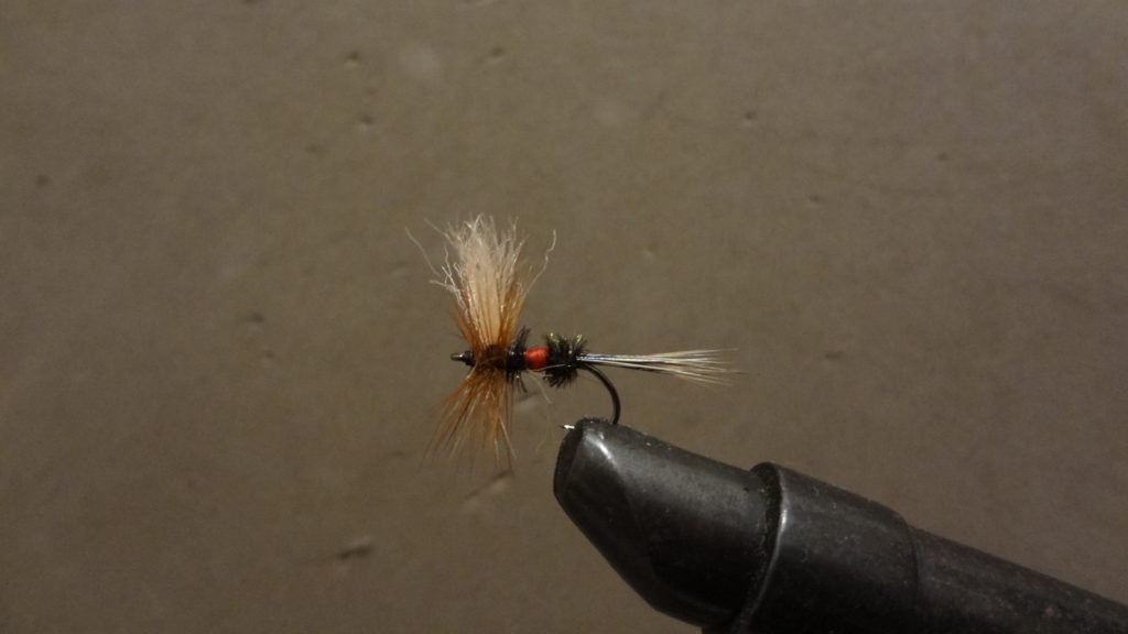 ポイントはウィング部の作成です。ウィングを左右対象に立ち上げるのですが、フライを正面から見たときにキレイなV字となるように意識して形作るようにしてください。最初にたすき掛けのようにウィングを分けるようにスレッドを巻いてからウィングの根元を巻くとよいです。